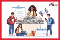 - Élections - Choisissez vos représentant.e.s : renouvellement complet des représentants, des personnels au Conseil de gestion de l’UFR de Droit22 avril 2026 - 23 avril 2026Vous êtes de l’UFR de Droit de l'Université Paris-Est Créteil, vous êtes appelé.e.s à voter pour élire un.e représentant.e au Conseil de gestion.