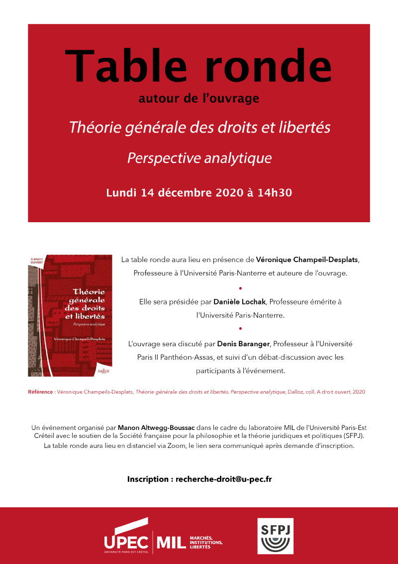 La table ronde aura lieu en présence de Véronique Champeil-Desplats, Professeure à l’Université Paris-Nanterre et auteure de l’ouvrage.